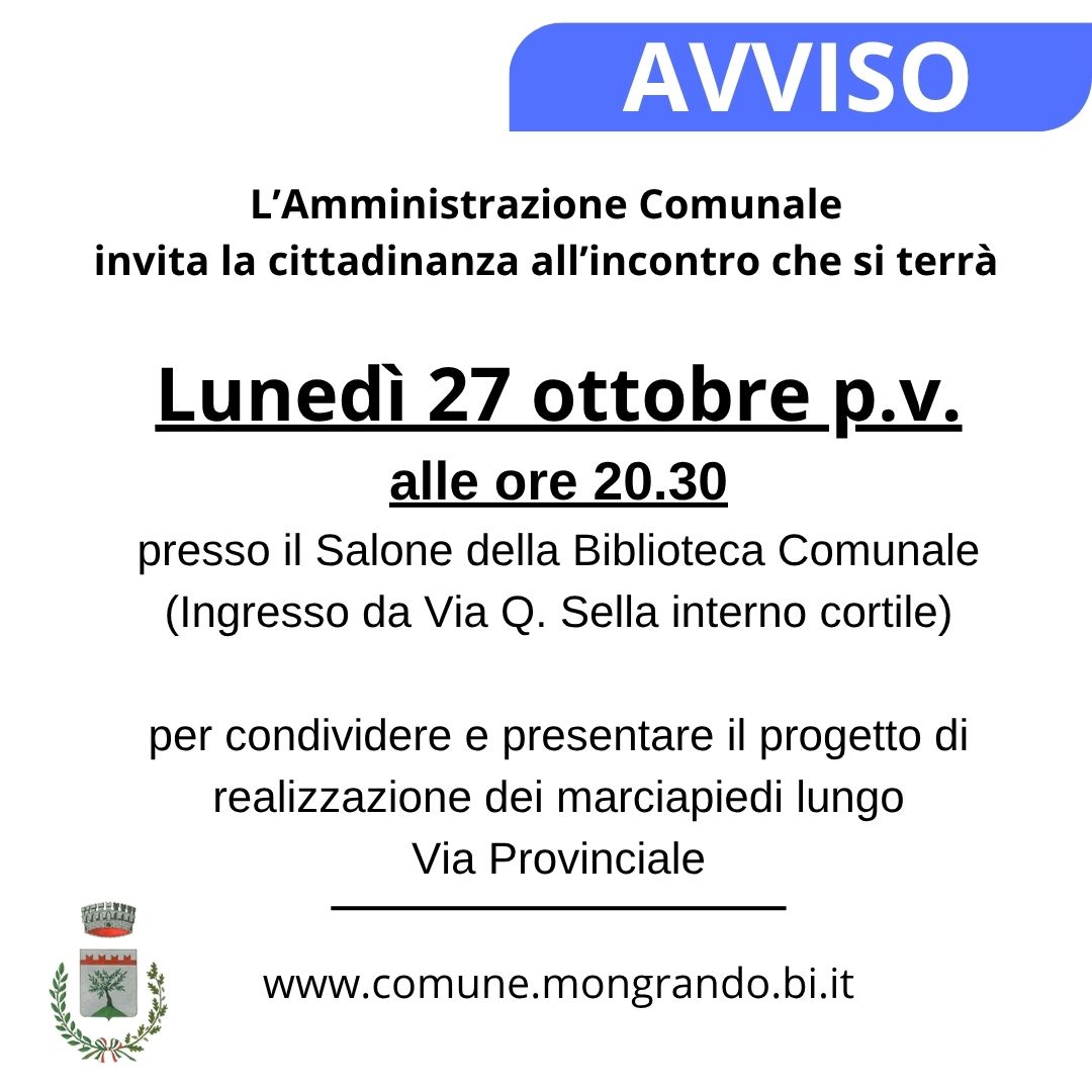 L’Amministrazione Comunale invita la cittadinanza all’incontro che si terrà Lunedì 27 ottobre p.v. alle ore 20.30 presso il Salone della Biblioteca Comunale (Ingresso da Via Q. Sella interno cortile) per condividere e presentare il progetto di realizzazione dei marciapiedi lungo Via Provinciale.