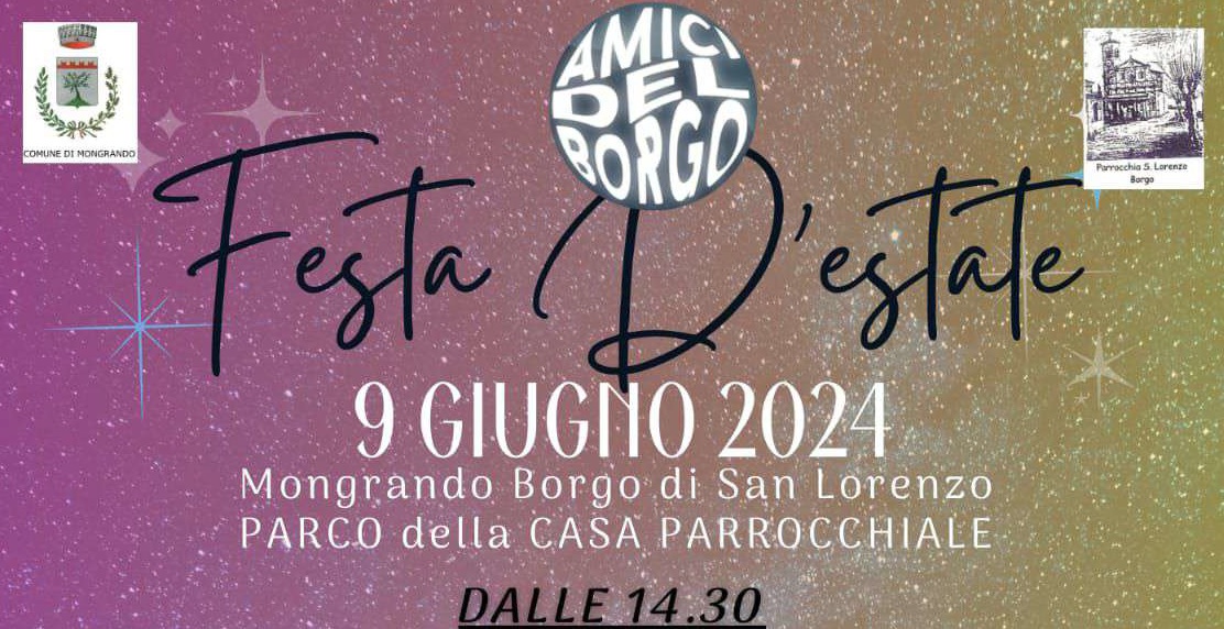 L'Associazione Amici del Borgo, con il patrocinio del Comune di Mongrando, organizza "Festa d'Estate" il 9 giugno 2024 dalle ore 14.30 presso il Parco della Casa Parrocchiale a Mongrando Borgo di San Lorenzo.