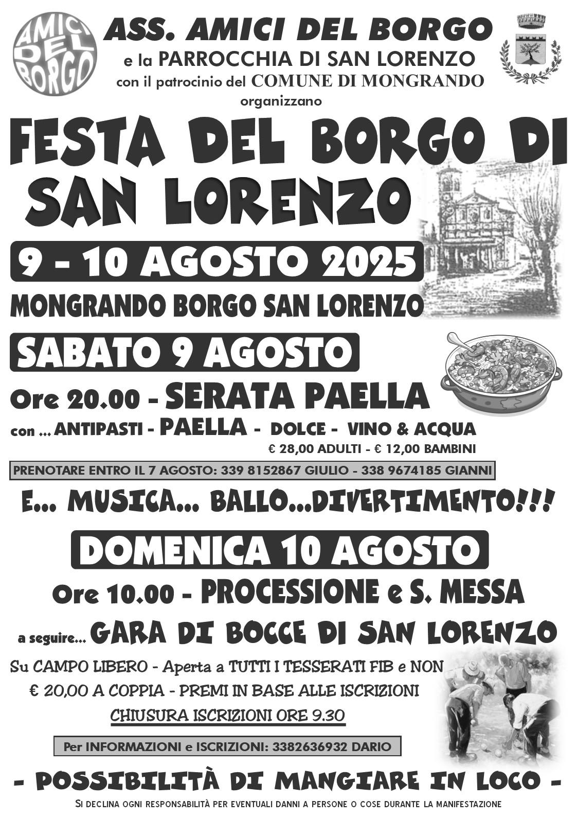 L'Associazione Amici del Borgo e la Parrocchia di San Lorenzo, con il Patrocinio del Comune di Mongrando, organizzano per sabato 9 e domenica 10 agosto 2025 la "Festa del Borgo di San Lorenzo"