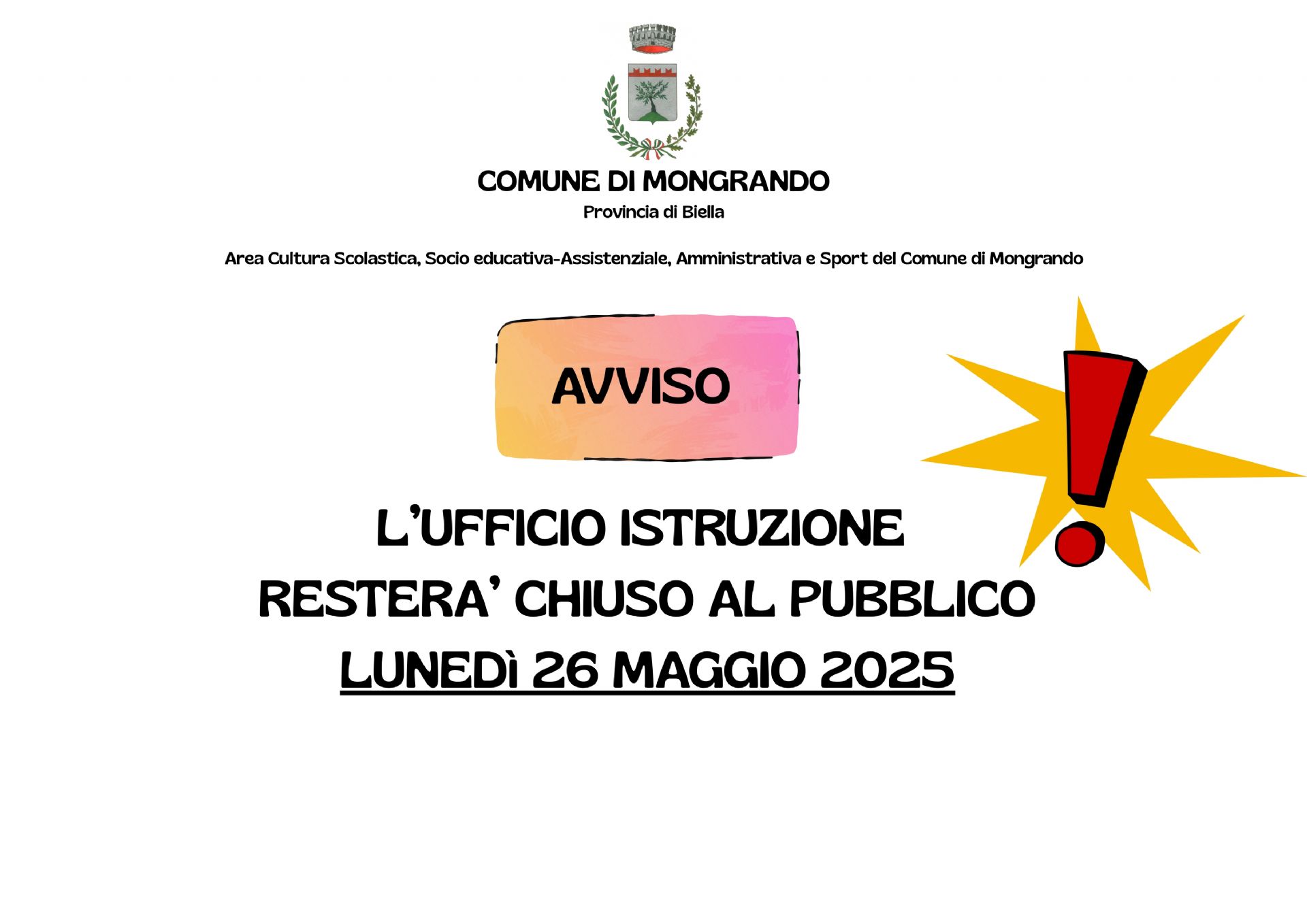 Si informano i cittadini che il giorno Lunedì 26 Maggio 2025 l'Ufficio Istruzione resterà chiuso al pubblico.