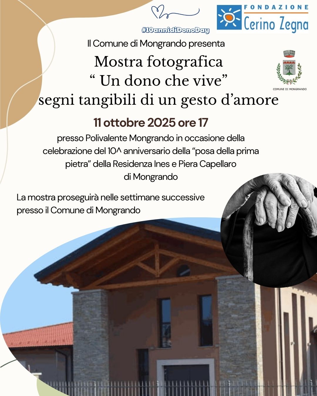 In occasione del 10° anniversario della posa della prima pietra della Residenza "Ines e Piera Capellaro", il Comune di Mongrando presenta presso il Polivalente la mostra fotografica "Un dono che vive - segni tangibili di un gesto d'amore".